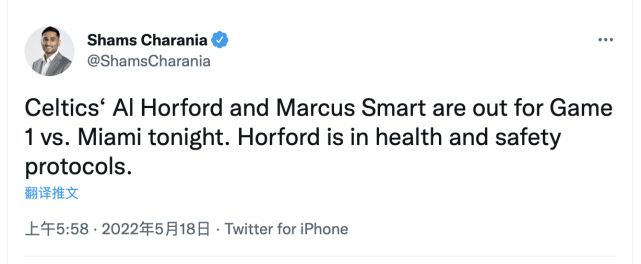 相比之下,凯尔特人阵中明显遭受更严重的伤病问题,据美媒沙姆斯-查拉尼亚的说法,凯尔特人悍将马库斯-斯马特和艾尔-霍福德都无法出战对阵热火东决系列赛的首场比赛:
