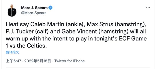 北京时间5月18日,热火迎来对阵凯尔特人的东决系列赛首场比赛,在这场比赛之前,热火阵中伤病报告已经出炉,热火方面表示,凯莱布-马丁、马克斯-斯特鲁斯、PJ塔克和盖布-文森特等球员能在赛前进行热身,并且都打算在对阵凯尔特人的东部首场比赛中出战: