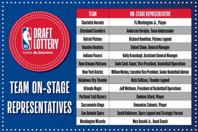 这其中,洛城双雄湖人与快船固然无缘季后赛,但他们今年的首轮签均已经在过往交易中送给其他球队,因而如此两队并未派出代表参加乐透抽签大会,有13队派出代表参加乐透抽签仪式,各队抽签代表如下:
