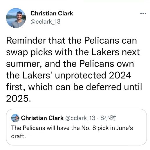 湖人更为悲催的是,他们与鹈鹕的交易送出了3个首轮签。根据鹈鹕记者Christan Clark报道,鹈鹕还拥有明年与湖人互换首轮签的权利。除此之外,鹈鹕还有权在2024年或者2025年,再挑选湖人任意一个首轮签。