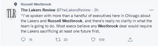 北京时间5月19日,根据美国媒体The lakers Review的报道,我们在芝加哥已经跟很多球队的高管谈论过关于拉塞尔-维斯布鲁克的事情,现在还不清楚湖人究竟要做什么。大多数的高管认为,任何有关威少的交易都需要湖人首先牺牲至少一个未来的首轮签。