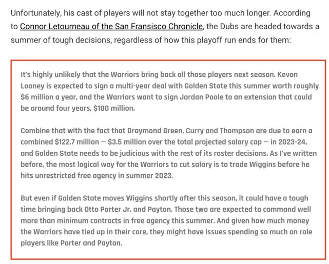 考虑到库里、汤普森、格林和威金斯等球员的合同,甚至勇士还需要与乔丹-普尔完成续约合同,这些都是勇士不得不牺牲某些球员的原因。
