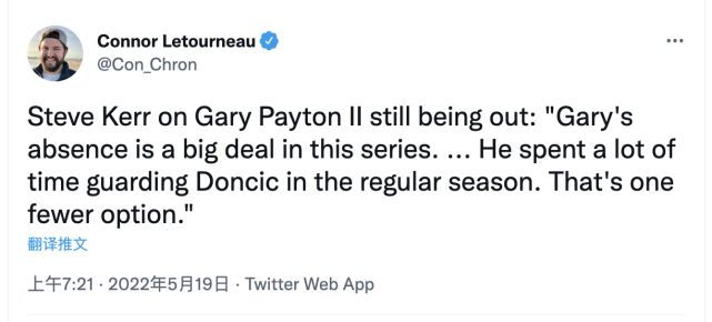 “加里的缺席在这个系列赛中会是一件大事,他在常规赛期有很多时间是在防守东契奇,所以他是为数不多的理想人选。”