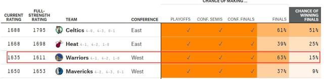 赢下首战后,勇士晋级概率升到了63%,夺冠概率15%排名第三。