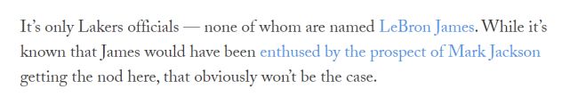 这也意味着只有马克-杰克逊是彻底没戏的状态。查拉尼亚报道称,湖人的高管们决定了教练人选,而参与决策的没有詹姆斯。众所周知,詹姆斯最希望马克-杰克逊出任湖人主帅,还曾经对他的前景感到兴奋,但马克-杰克逊没有入围最终候选名单,已经说明了湖人的态度。另外,所有候选人都被要求谈论威少的使用问题,这也意味着湖人做好留下威少的准备了。