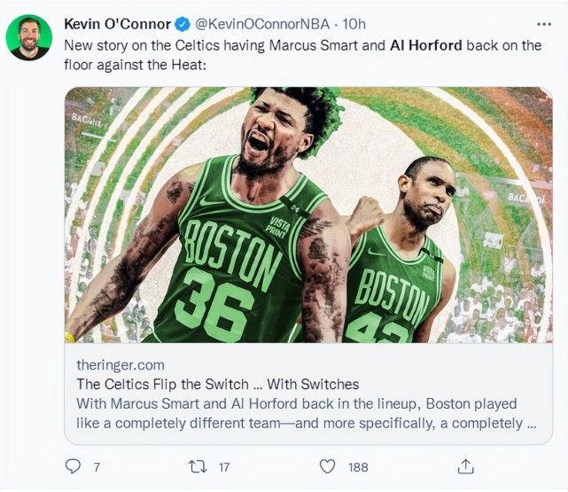 北京时间5月21日,NBA记者凯文-奥康纳详细的分析了马库斯-斯玛特与艾尔-霍福德两位绿凯球员复出后凯尔特人在防守端打出的表现,文中写道:巴特勒G2传球42次比G1的39次还多3次,但热火球员的命中率从42.3%下滑到26.3%,巴特勒并不自私只是队友投不进,霍福德就上半场防守热火挡拆13次,热火只艰难的拿下2分。