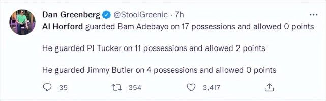 绿凯记者统计的防守数据没有误差,对位阿德巴约17个回合热巴0分;对位塔克11个回合他就2分,对位巴特勒4个回合只有2分,霍福德无愧是绿凯的防守尖兵。