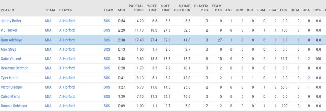 上图是NBA官方霍福德防守热火的数据:对位巴特勒4个回合是2中0,对位阿德巴约17个回合热巴没出手0分,对位塔克1中1,对位文森特3中2,对位希罗3中0,对位奥迪2中1,对位邓罗1中1,合计是15中5已经很出色了。