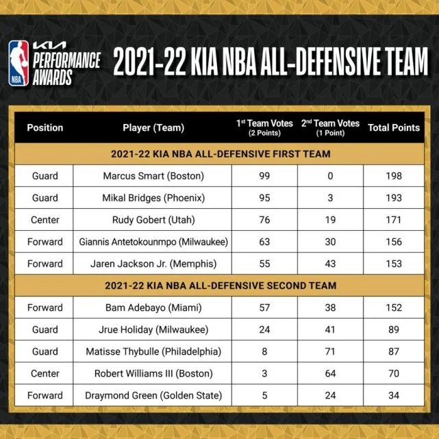NBA官方随后公布了具体得分情况,其中,得票最高的是斯马特,他得到了99张第一选票,累计198分,布里奇斯得分第二,他得到193分。追梦是二阵得分最低的,他得到34分。
