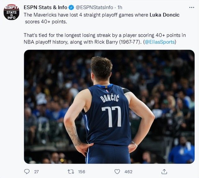2.东契奇季后赛拿下40+的比赛,独行侠是2胜6负。