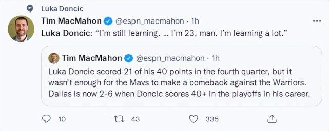 东契奇在赛后谈到了被威金斯隔扣的话题,他表示:那球我的确被打到了,不过确实令人印象深刻,我没有说谎。我才23岁仍然在学习,我才23岁兄弟,我已经学到了很多东西。