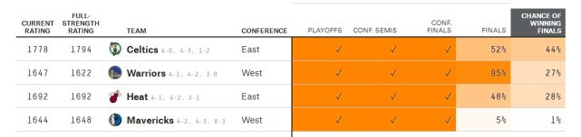 3.东契奇这三场比赛在场净负61分独行侠最差,而维金斯在场净胜66分勇士最佳;