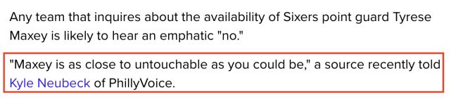 另一方面,已经进入休赛期阶段的76人也要面临一系列问题,而据美媒凯尔-纽贝克的说法,即便联盟中有不少对泰瑞斯-马克西感兴趣的球队,但76人对马克西的交易态度是“非卖品”: