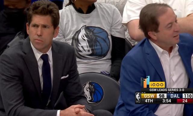 勇士末节看似放弃比赛,派上大量替补,没想到竟然疯狂追分。 前方镜头捕捉到有趣的一幕,看到分差缩小,勇士总经理鲍勃-迈尔斯皱着眉,歪着嘴,一脸懵。拉科布则露出神秘的微笑。