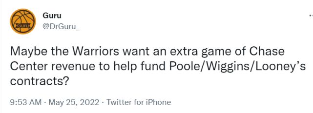 有球迷写道:“可能勇士想要多一场大通中心的收入,来帮助支付普尔、维金斯和卢尼的合同薪水。”还有球迷表示,多打一个主场,能让勇士的奢侈税压力减轻一些。