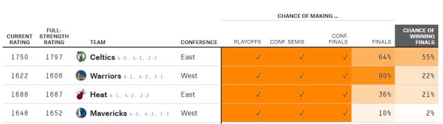 北京时间5月25日,NBA分区决赛继续展开争夺,勇士在西决G4战最多时刻落后29分,哪怕末节一度追到差8分仍功亏一篑,勇士无缘横扫仍3-1领先灰熊。美国数据媒体Fivethirtyeight公布最新概率局势,勇士晋级总决赛概率下滑至90%依然领跑,凯尔特人64%第二,独行侠升至10%仍垫底。夺冠概率方面凯尔特人进一步提升至55%继续大幅领先,勇士22%与热火21%分列二三位,独行侠2%垫底。