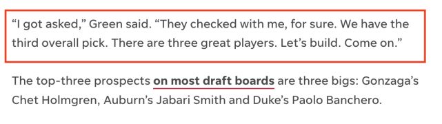 “有人问过我,”格林说道,“他们和我谈过,我们有第三顺位的选秀权,现在有三名出色的年轻球员可供选择,我们将会建立起更好的阵容。”