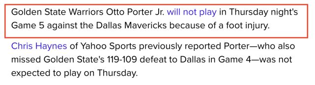 雅虎体育记者克里斯-海恩斯此前曾报道过小奥托-波特会缺席对阵独行侠系列赛的第4场比赛: