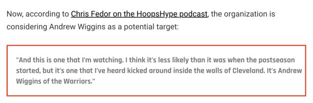 另一方面,据美媒克里斯-费尔多的说法,目前骑士正在考虑今年休赛期推动涉及安德鲁-威金斯的交易: