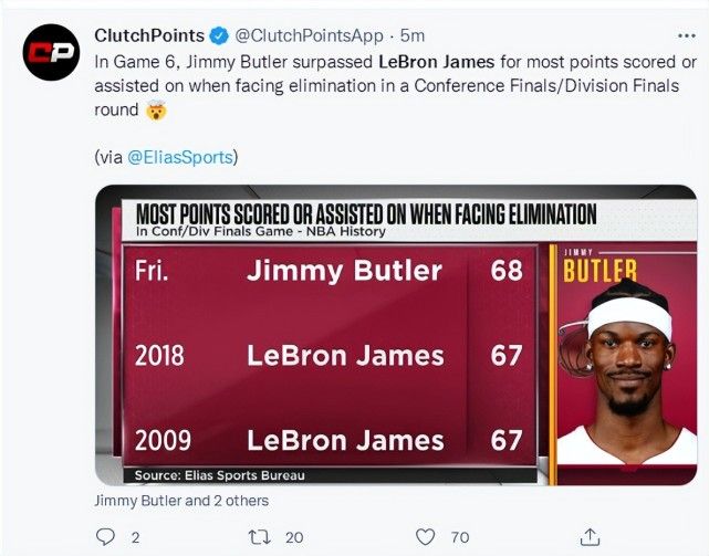 赛前美媒就开始渲染巴特勒的恐怖,巴特勒在半决赛或分区决赛面临淘汰时得分+助攻的数据已经是68分超过了2018年的勒布朗67分与2009年的詹姆斯67分。G6一战他复刻12詹‘死亡之瞳’拿下47+9+8+4+1带队取胜。这场抢七他险些复刻12詹31+12的神迹,他个人的表现已经无懈可击。