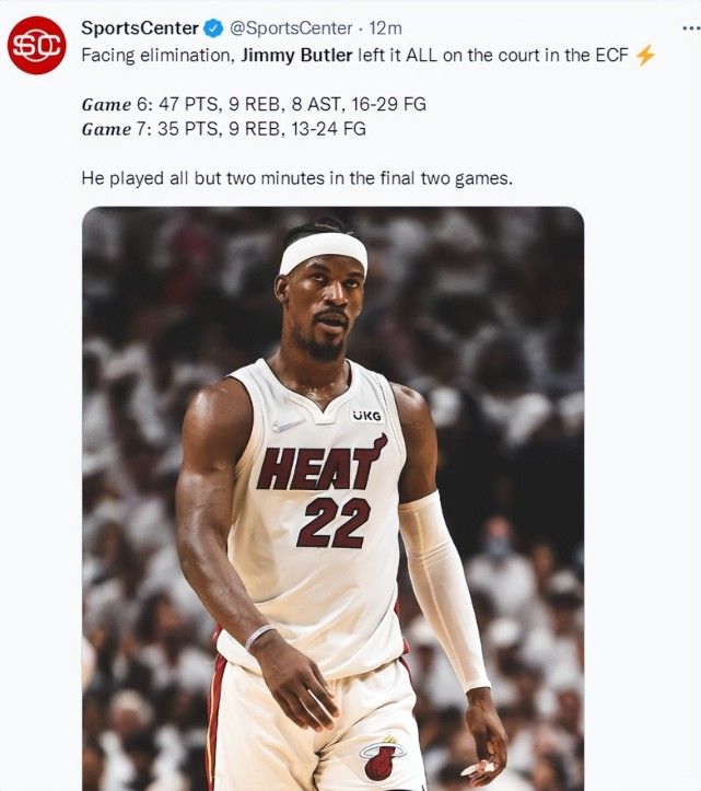 美媒SC写道,最后的两场东决比赛巴特勒只休息了2分钟,一场47+9一场35+9,我们不能要求他更多。