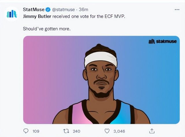 美媒stamuse写道,巴特勒抢七打满48分钟,他付出了一切。他获得一张东决MVP选票,他值得更多。