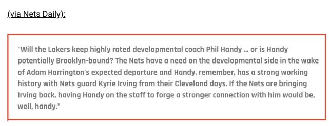 当然,目前湖人似乎还会继续留下汉迪,但如果有这个机会,相信篮网也会有所举动。