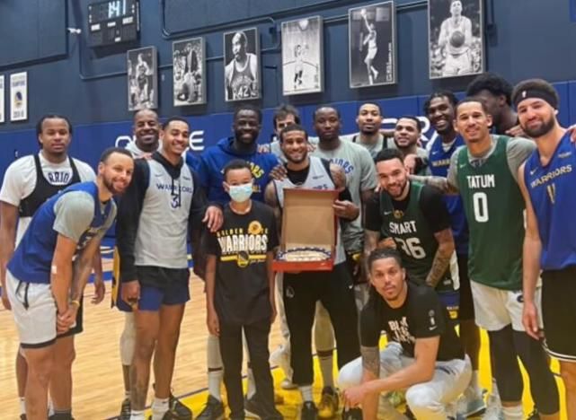 勇士训练中的另一次大规模欢呼,是送给小佩顿的。全队给了小佩顿一个惊喜,教练组突然宣布小佩顿拿到了2022年NBA鲍勃-兰尼尔社区关怀奖,库里和队友们在小佩顿身边又叫又跳,大家还合影留念。