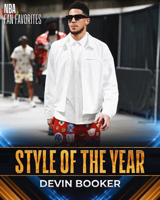 球迷票选的年度最佳时尚奖,授予了太阳球星德文-布克。布克的穿搭时尚获得了球迷的认可,他的女友詹娜是时尚界的顶流,布克自己的衣品也很不错。
