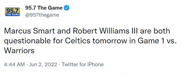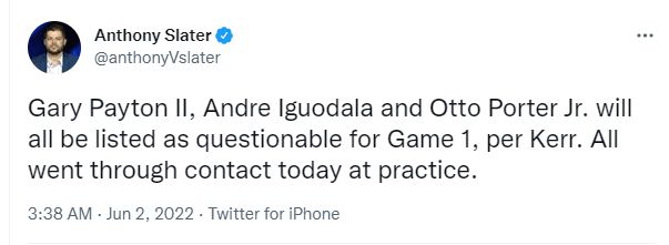 北京时间6月2日,勇士和绿军公布了总决赛G1的伤情报告。勇士一方,怀斯曼确定缺阵,小佩顿、伊戈达拉、波特三人均被列为出战成疑。绿军一方,豪瑟确定缺阵,斯马特和罗威也是出战成疑。科尔表示,小佩顿、伊戈达拉和波特都参加了混合训练,离复出又近了一步。斯马特直言自己脚踝依然疼痛,但他妈妈说如果能上场就别找借口。