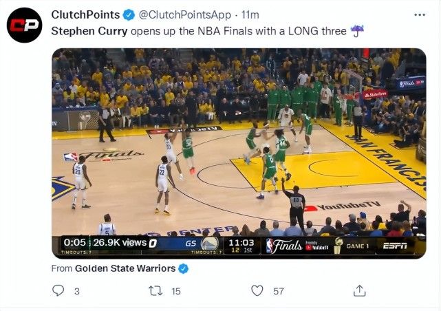 北京时间6月3日,凯尔特人VS勇士的总决赛G1打响,这场比赛对于绿凯来说很不一样,他们阵容中没有球员打过总决赛,而勇士的库里、克莱、追梦、鲁尼都是总决赛常客。开场库里就爆炸,单节9中7,三分8中6拿下21分3篮板2助攻帮助勇士领先。