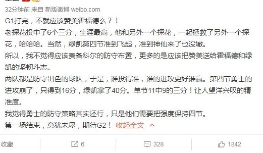 王猛进一步解释,“两队都是防守出色的球队,于是谁投得准,谁的进攻更好谁赢。第四节勇士的进攻崩了,只得到16分,绿凯拿了40分。单节11中9的三分!让人望洋兴叹的精准度。我觉得勇士的防守策略其实还行,只是他们需要把强度保持四节。第一场结束,意犹未尽,期待G2战!”