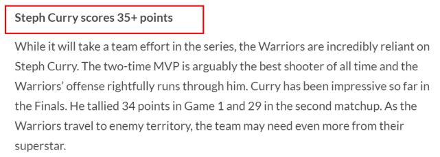 虽然勇士强调团队协作,但总决赛前两战,他们非常依赖斯蒂芬-库里。库里是有史以来最好的射手,前两场发挥也很出色,G1得到34分,G2得到29分。如今客场作战,勇士或许需要一个火力更猛的库里,才能拿下比赛。美媒预测库里能在G3保持火热的手感,并再创今年总决赛的个人得分新高。