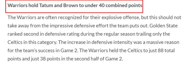 布朗和塔图姆,受到了勇士的限制。两人在G1总共只得到36分,在G2也总共得到45分,这明显低于他们平常的效率。塔图姆和布朗在常规赛平均能合砍超过50分。美媒预测勇士能继续限制塔图姆和布朗,并进一步降低他们的得分,有望将两人总分防到40分以内。