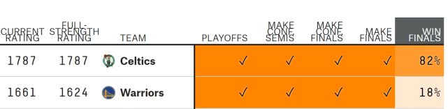 虽然clutchpoints看好勇士能在G3迎来爆发,但数据网站FiveThirtyEight则更看好绿军拿下G3。他们给出的概率显示,绿军有78%的概率拿下这场胜利,而在夺冠概率方面,他们也标注绿军是82%,勇士仅有18%。