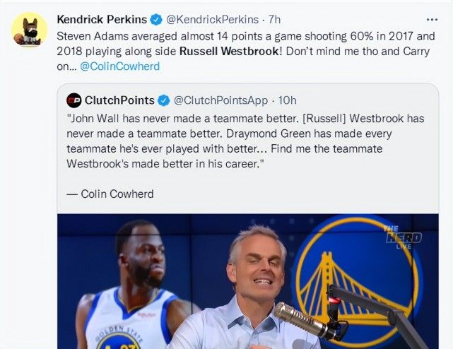但评论员colin-Cowherd还是炮轰了威少,他表示:沃尔、威少从未让一个队友变得更好,德雷蒙德-格林让与他合作的每个队友都变得更好,给我找一个威少在职业生涯中变得更好的队友出来?