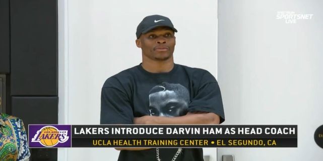 北京时间6月7日,湖人球员拉塞尔-维斯布鲁克参与了球队新主帅达尔文-哈姆的新闻发布会,威少、里夫斯、加布里埃尔三人都参与了发布会不过没有接受采访,看样子威少挺喜欢湖人这位新主帅。