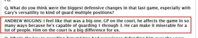 队友维金斯谈到小佩顿时表示:“球场上的小佩顿在很多方面都影响着比赛,因为他有能力从1号位防到3号位,他能让对手痛苦不堪,他在球场上对我们来说是一个很大的改变。”
