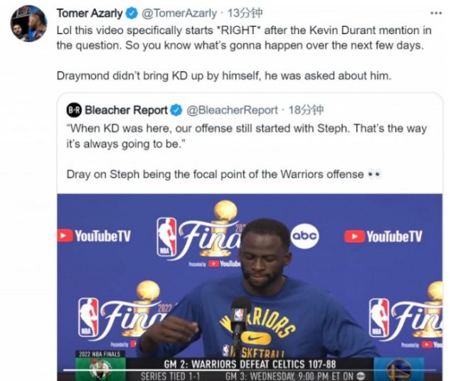在今日勇士训练结束之后,追梦格林在被问到有关汤神的问题时,他发现提问的记者是此前采访他的快船记者Tomer Azarly。当时Tomer Azarly是主动提到杜兰特,而露天看台体育则是截取了部分内容,将记者提到杜兰特的内容给删减掉,让人误以为是追梦格林主动去提杜兰特。