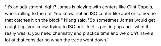 76人在过去这个赛季依靠恩比德和哈登的组合仍无法取得成功,而76人前锋乔治-尼昂在现身一档播客节目时谈及了两人之间的关系,尼昂表示恩比德根本不是哈登所习惯的那种“吃饼型”中锋,而且两人也缺乏一起练习的时间: