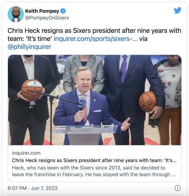 另一方面,据报道,76人总裁克里斯-赫克在为76人效力9年时候后正式辞职: