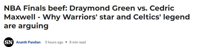 北京时间6月8日,NBA总决赛战成1-1平,但一场意料不到的口水战已经在两人之间打响。一方是66岁的绿军名宿塞德里克-马克斯韦尔,另一方是32岁的勇士球员追梦-格林。