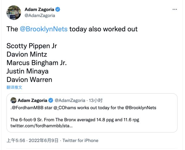 最后需要谈及的是,美媒公布篮网进行试训的新秀球员名单: