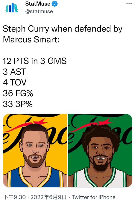 除此之外,库里3场总决赛7次失误,但面对斯马特出现4次失误,超过一半之数。库里面对斯马特时投篮命中率与三分命中率均不足4成,但他总决赛投篮命中率与三分命中率均是接近5成,自然是形成鲜明的对比。