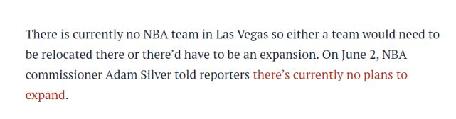 目前联盟在拉斯维加斯并没有一支NBA球队,因此 ,美媒列出詹姆斯拥有球队的两个方案,要么买一支现有球队搬迁到那里,要么就是联盟进行新军扩张,成为新军的老板。那里是NBA夏季联赛的举办地,美国男篮的训练营一般也都安排在拉斯维加斯举办。