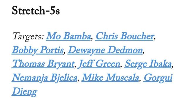 目标球员:班巴、布切尔、波蒂斯、戴德蒙、托马斯-布莱恩特、杰夫-格林、伊巴卡、别利察、穆斯卡拉、迪昂