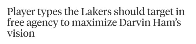 湖人新帅哈姆已经上任,他是一位偏向防守的教练,希望在改善湖人防守的基础上重新打造进攻体系。北京时间6月10日,湖人跟队名记Jovan Buha根据哈姆的战术特点,晒出了湖人在自由球员市场上的4大签约需求。他们能动用的只有630万美元左右的奢侈税中产特例和底薪合同。
