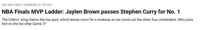 NBA总决赛进行到第三场,目前,绿军2比1领先勇士。外界纷纷看好凯尔特人本赛季能拿下总冠军。勇士目前处在水深火热之中,不仅丢掉了小天王山之战,库里还在第三场比赛中受到了伤病影响。而在本场比赛之后,美国媒体也给出了本赛季总冠军MVP的榜单,其中绿军三人上榜,勇士两人入选。