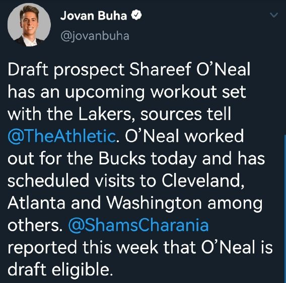 作为名宿之子的沙里夫已经22岁,他今年自动拥有参加NBA选秀资格,并且根据洛杉矶记者Jovan Buha报道,奥尼尔的长子计划去湖人试训,而他已经为雄鹿进行试训,还计划参加骑士、老鹰与奇才的试训。
