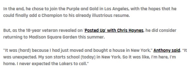 “离开尼克斯很艰难,因为我刚搬家,并在纽约买了房子,”安东尼去年曾经表示,“这是出乎意料的。我儿子今天还在纽约开始上学。因此就像我在这里,我要回家了。只是我没想到湖人会打电话来。”